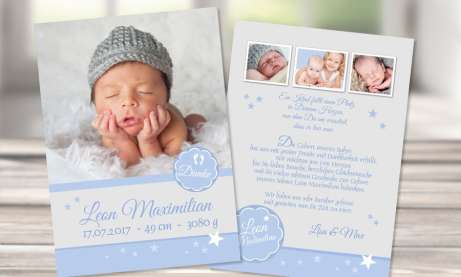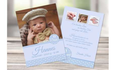 Zaubern Sie Ihren Liebsten ein Lächeln ins Gesicht. Mit dieser wundervollen Dankeskarte zur Geburt können Sie auf schönste Art Danke sagen, für die lieben Aufmerksamkeiten und Geschenke. Die Dankeskarte ist in unserem portofreundlichen DIN A6 Format gestaltet und hat auf der Vorder- und Rückseite einen modernen Button mit der Aufschrift "Danke" und dem Namen Ihres Babys. Besonders schick und modern wird die Pünktchen Borte am unteren Ende der Dankeskarte. Im Mittelpunkt der Karte stehen die bezaubernden Babyfotos Ihres Kindes, der Babyname sowie die stolzen Geburtsdaten. Die Rückseite bietet Platz für drei weitere Fotos und einem ganz lieben Dankestext.