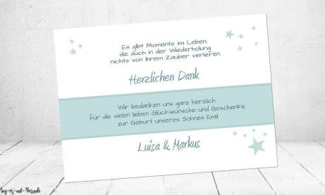 Wundervolle Dankeskarte zur Geburt Ihres Babys im portofreundlichen Postkartenformat. Auf diese rührende Dankeskarte zur Geburt haben Ihre Familien und Freunde gewartet. Verzieren Sie sie mit persönlichen Fotos und Erinnerungen, die von kleinen Schmetterlingen oder Sternen umrandet werden. Ob in hellblau oder rosa - Ihre Farbvorstellungen und persönlichen Wünsche stehen für uns im Mittelpunkt. Teilen Sie uns diese einfach über die Produktanpassung mit und freuen Sie sich auf ein wunderschönes Ergebnis direkt vom Designer im praktischen Postkartenformat.