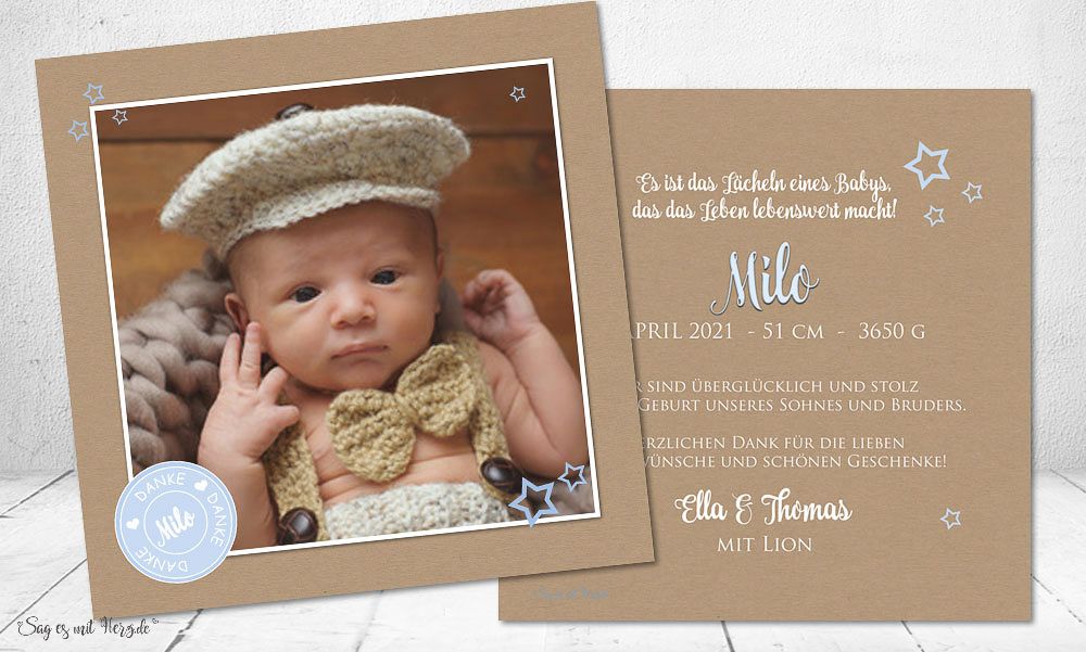 Ob als Postkarte auf Kraftpapier oder mit feiner Leinenstruktur – jede Karte wird mit viel Liebe zum Detail individuell gestaltet. Der Fotodruck, die Sterne, der Button mit Namen und Herzchen sowie die modernen Schriften machen diese Dankeskarte zur Geburt zu einem besonderen Erinnerungsstück.