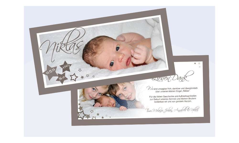 Mit dieser exklusiven Danksagungskarte können Sie sich für die liebevollen Geschenke zur Geburt Ihres Babys bedanken. Mit den Fotos Ihres kleinen Engels und Ihrem individuellen Text wird Ihre Karte zu einem einzigartigen Unikat.