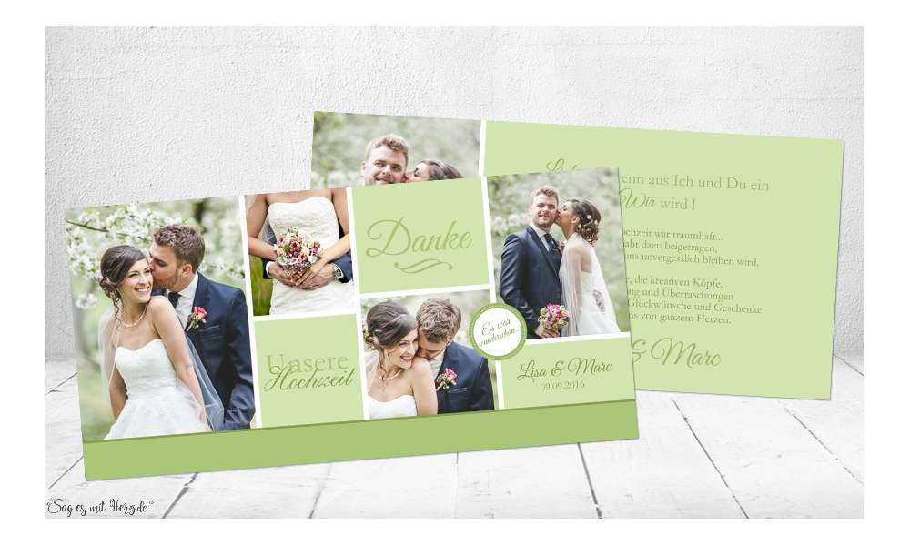 Für einen richtigen Mädchentraum in rosa haben wir diese Danksagungskarte zur Hochzeit gestaltet. Rosa - altrosa - rosa liegen im Moment sehr im Trend und sehen schick und edel aus. Wenn auch Sie Ihre Hochzeit mit edlen rosa Tönen geschmückt hatten, ist diese Danksagungskarte genau das richtige für Sie. Auf der Vorderseite stehen neben 4 wundervollen hochzeitsfotos die wichtigsten Details für Ihre Karte "Danke", "Unsere Hochzeit" sowie Ihre Namen und das Hochzeitsdatum. Die Rückseite bietet weiteren Platz für einen ausführlichen liebevollen Dankestext und ein weiteres schönen Hochzeitsbild. Natürlich gestalten wir Ihnen die Dankeskarte auch in allen anderen gewünschten Farben.