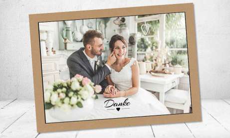 Unsere schlichte Danksagung "Postkarte Vintage" haben wir im portofreundlichen Postkartenformat für Sie gestaltet. Die Karte wird auf modernem Naturkarton gedruckt und verleiht ihrem Dankeschön den zauberhaften naturell Look. Schlicht und elegant fügen sich die schwarzen Schriftzüge auf dem Kraftpapier ein. Somit ist die Karte modern und herzlich, aber nicht zu kitschig. Genau das Richtige, für Ihre Nature / Vintage Hochzeit. Im Mittelpunkt Ihrer Danksagung steht Ihr schönstes Hochzeitsfoto, welches mit einem dezenten "Danke" auf der Vorderseite erscheint.