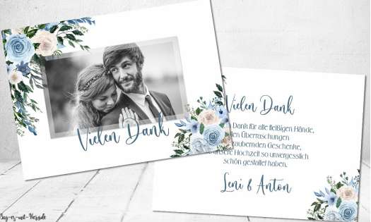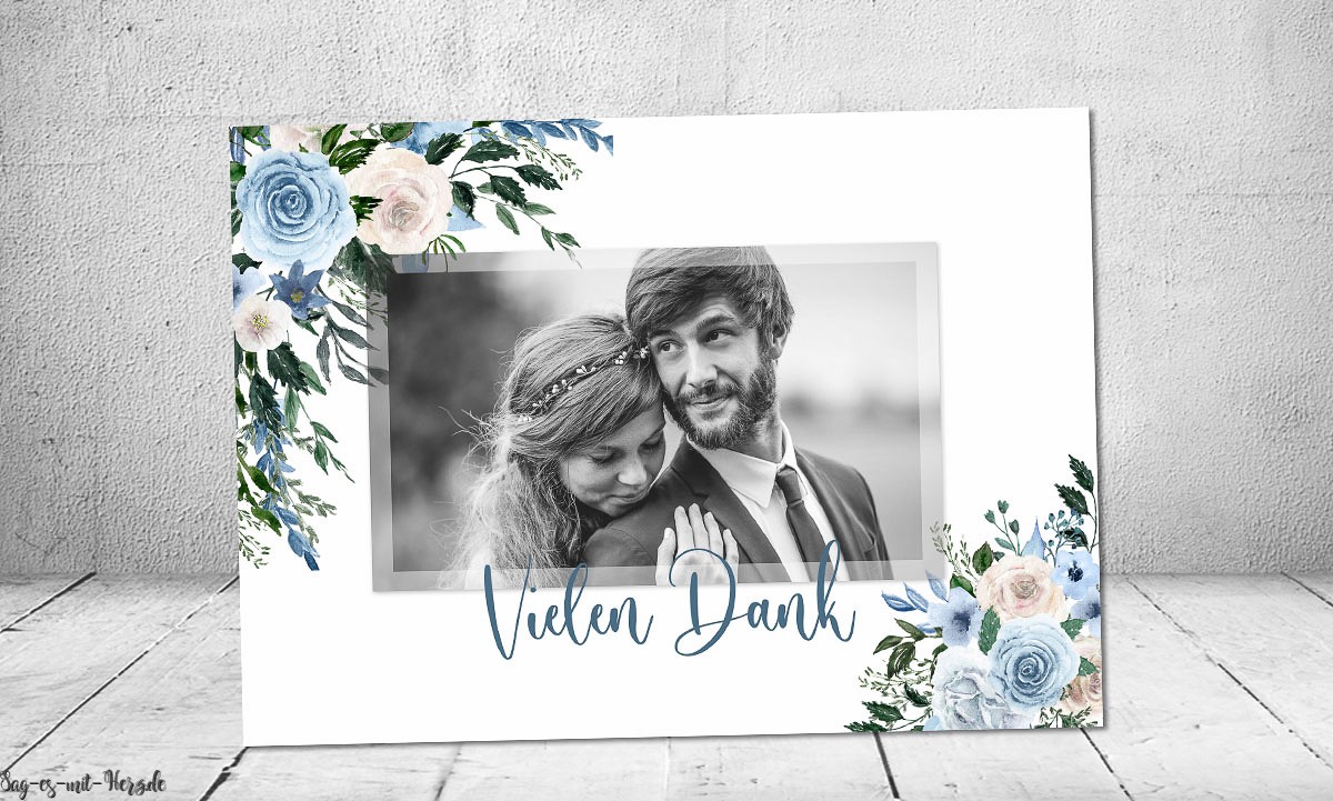 Sagen Sie auf wundervolle Art Danke! Ihre individuellen Worte und ihr schönstes Hochzeitsfoto machen diese wundervolle Dankeskarte im floralen Boho Aquarell Stil zu einem Unikat. Wir gestalten Ihre Dankeskarte kostenlos für Sie gemäß Ihren Wunschvorstellungen.