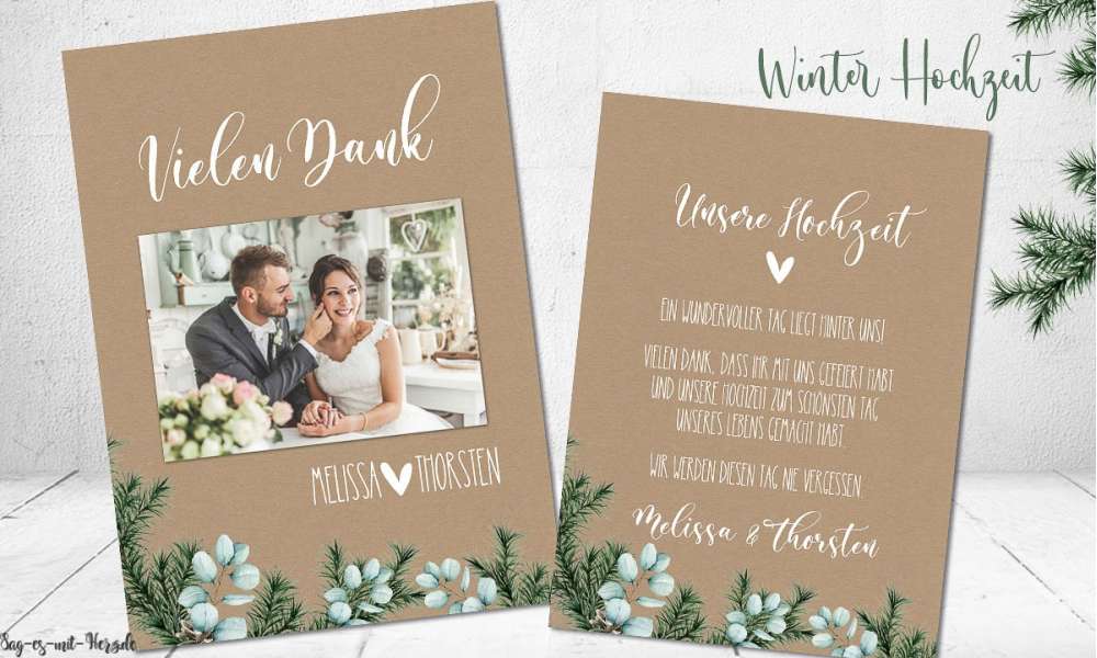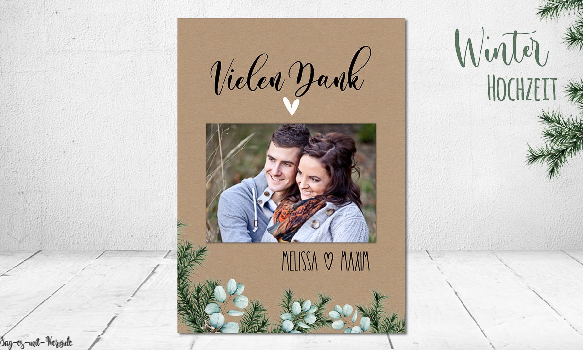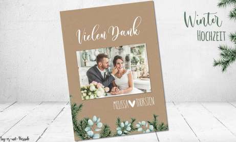 Eine wundervolle Art um Danke zu sagen. Die zauberhafte Dankeskarte passt perfekt zu Ihrer Vintage Winterhochzeit. Sie bietet Ihnen Platz für Ihr schönstes Hochzeitsfoto und Ihren ganz persönlichen Dankestext zur Hochzeit. Sie ist auf naturbraunem Reyclingpapier mit Kraftpapieroptik bedruckt und damit die richtige Wahl für Nature Hochzeiten. Durch die edlen Aquarell gezeichneten Tannenzweige und modernem Eukalyptus wird Ihre Dankeskarte zu einem wunderschönen Hingucker. Die Danksagung ist im portofreundlichen Postkartenformat in DIN A6 gestaltet.