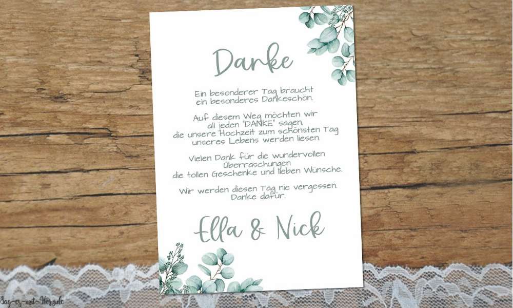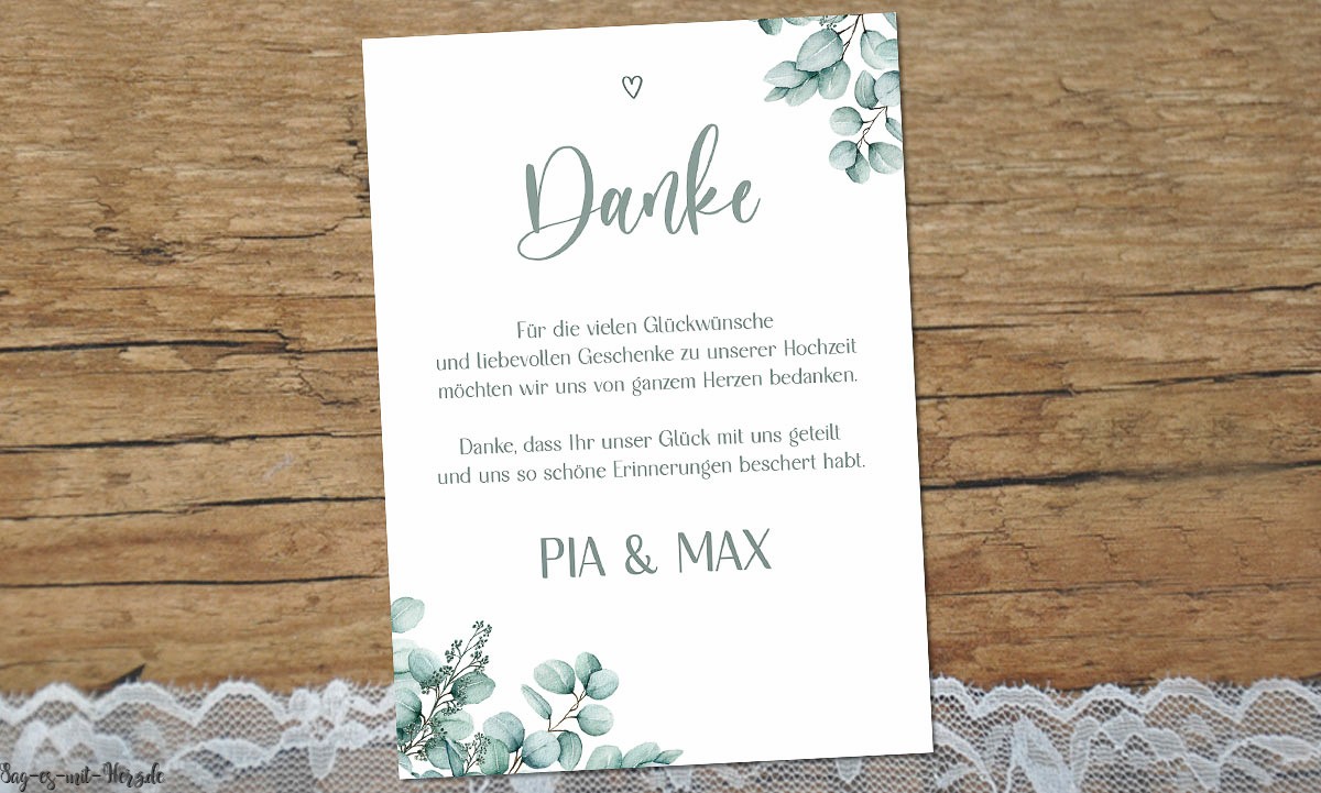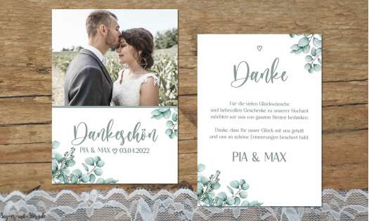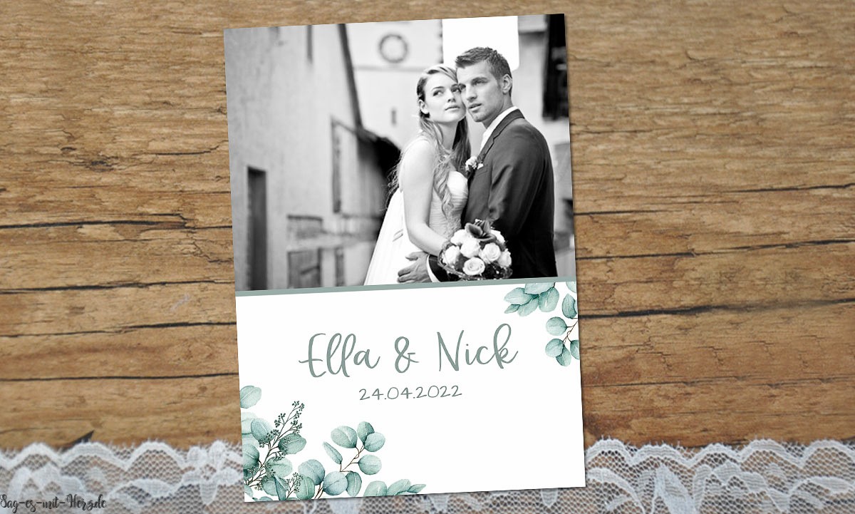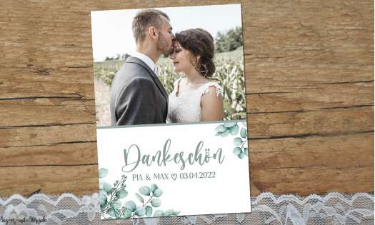 Mit dieser traumhaften Dankeskarte sagen Sie auf wundervolle Art Danke. Die Dankeskarte ist im portfreundlichen Postkartenformat DIN A6 gehaltet. Lassen Sie sich von unseren Greenery Kartenbeispielen inspirieren. Auf der Vorderseite platzieren wir Ihr schönstes Hochzeitsfoto, welches durch das Layout des Eukalyptus Greenery Vintage Stils abgerundet wird. Auf der Rückseite setzten wir für Sie Ihre Dankesworte mit modernen Schriftzügen in Szene. Wir gestalten Ihre Greenery Dankeskarten nach Ihren ganz besonderen Wünschen.
