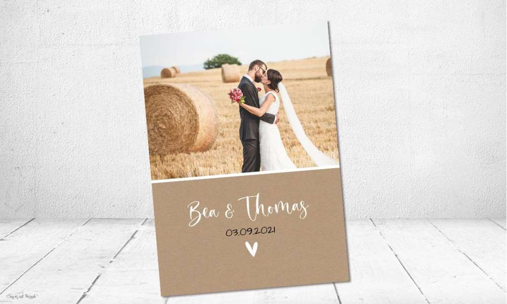 Wir platzieren mehrere Ihrer schönsten Hochzeitsfotos und wählen dafür den perfekten Bildausschnitt für Sie aus. Auch den Dankestext zur Hochzeit setzen wir mit Absätzen und Überschriften so um, dass er sich gut lesen lässt und seine perfekte Wirkung auf der Dankeskarte enthält.