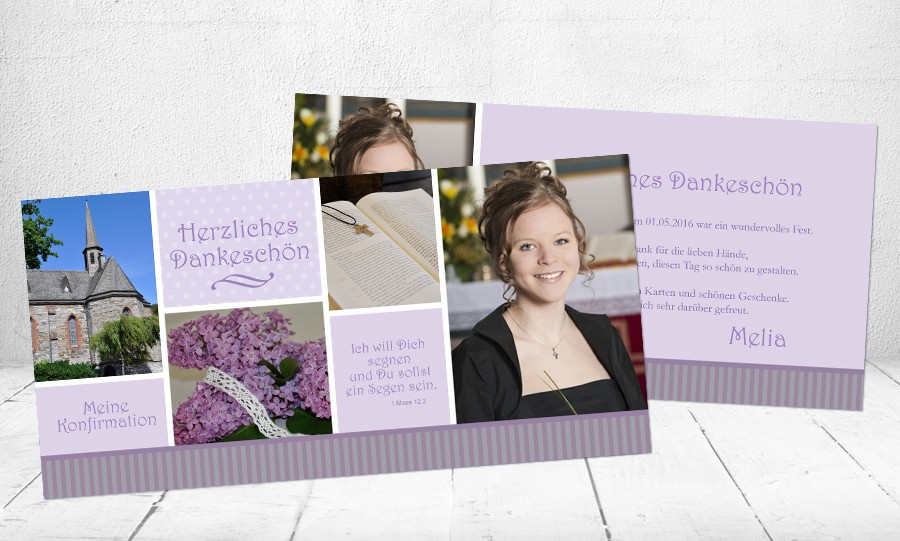 Wir gestalten Ihnen eine wunderschöne Dankeskarte, mit der Sie an das tolle Fest erinnern und sich für die Glückwünsche und Geschenke bedanken können. Mit Ihren individuellen Texten, dem Kommunions- / Konfirmationsspruch und schönsten Fotos Ihres Kindes, der Feier, der Kerze wird Ihre Danksagung besonders schön und persönlich.