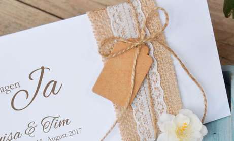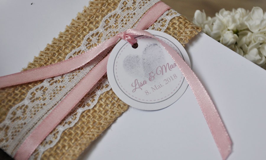Die Einladungskarten sind im modernen Format DIN lang gestaltet und werden mit einer wundervoll hübschen Bandereole aus Sackleinen und darauf befestigter Spitze verziert. Ein kleines Schleifchen aus Juteband oder Satinband mit einem Kraftpapier Anhänger geben der Karte ihren letzten Schliff.