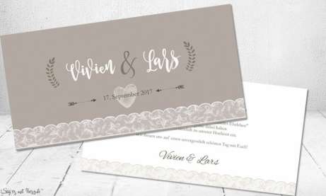 Diese Hochzeitseinladung kommt in aller Eleganz des Vintage-Stils daher. Durch die edlen Taupetöne und die Spitze am unteren Rand wird sie zu einem echten Hingucker. Liebevoll gesetzte Details wie ein Fingerprint als Herz und moderne Vintage Pfeile vollenden diese Einladungskarte, die Ihren Gästen ein Lächeln ins Gesicht zaubern wird.