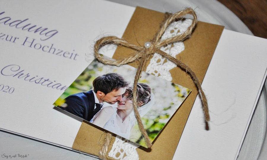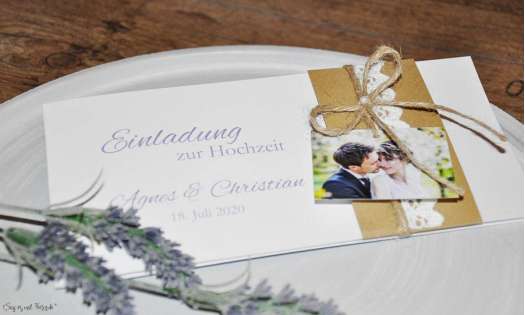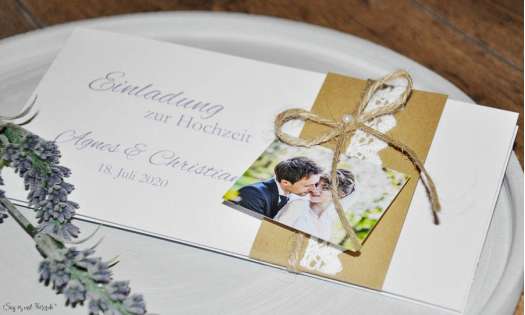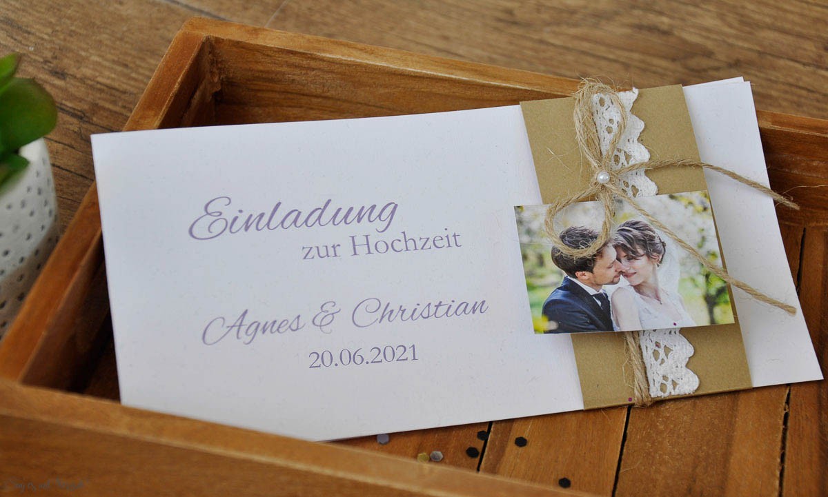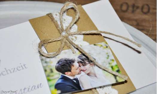 Vintage Einladungskarten Hochzeit mit Kraftpapier Banderole, Spitze und Foto