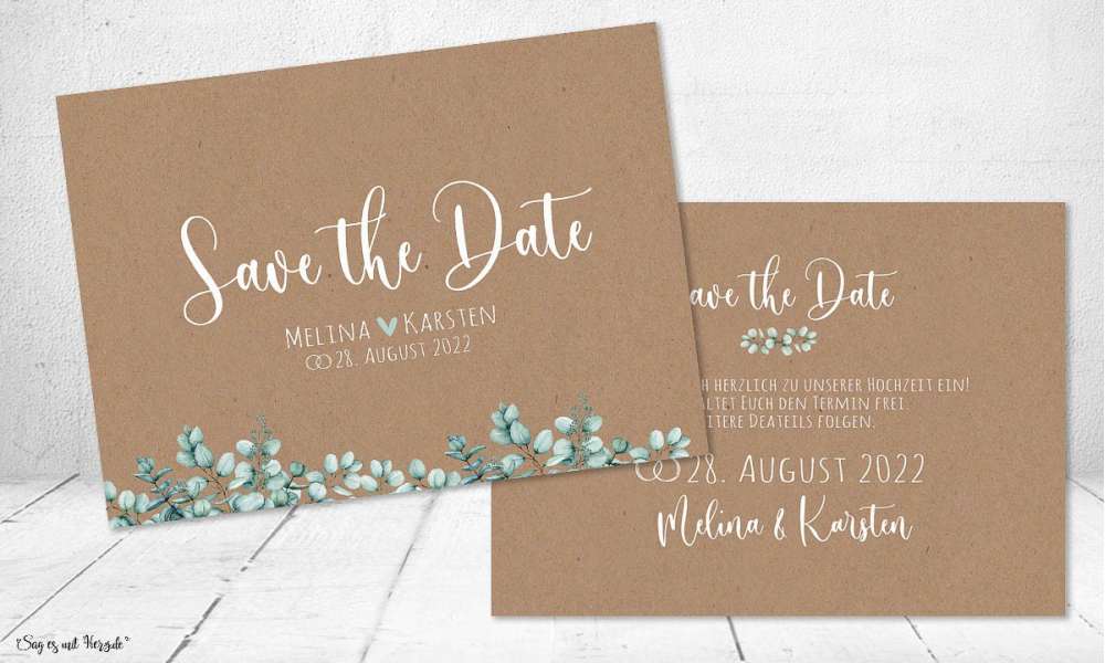 Alternativ zu der schlichten Einladung auf Kraftpapier mit weißer Schrift, können Sie die Karte auch mit verzierenden Eukalyptus Blättern erhalten.