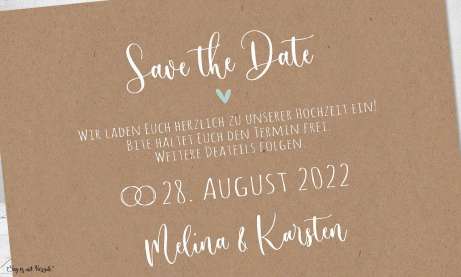 Im Vinatge Stile gehaltene Save the Date Einladungskarte aus rustic Kraftpapier zu Ihrer Hochzeit. Sie möchten an Ihrem schönsten Tag im Leben Ihre liebsten Menschen an Ihrer Seite dabei haben? Dann ist unsere Save the Date Einladungskarte als einfache Ankündigung mit Ihrem Hochzeitsdatum genau die richtige Einladungskarte für Sie. Teilen Sie uns Ihre Vorstellungen mit und wir gestalten diese Save the Date Karte zur Hochzeit mit liebevollen Details und nach Ihren ganz persönlichen Wünschen.