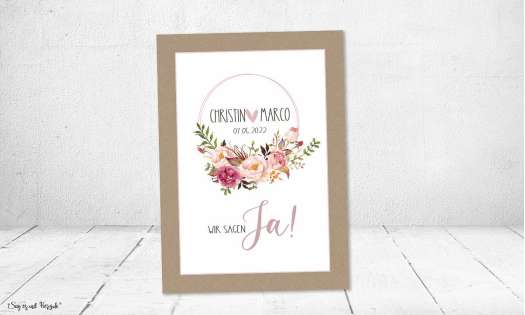 Diese romantische und zugleich moderne Einladungskarte zur Hochzeit lässt keine Wünsche offen. Die Einladungskarte besticht durch den verspielten Blumenring in rose, kombiniert mit rustic Kraftpapier. Damit passt sie perfekt zu Ihrer Boho Traumhochzeit.