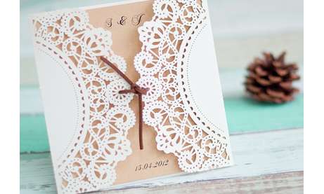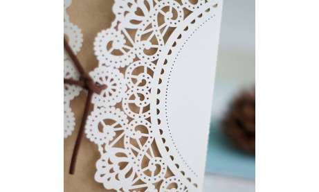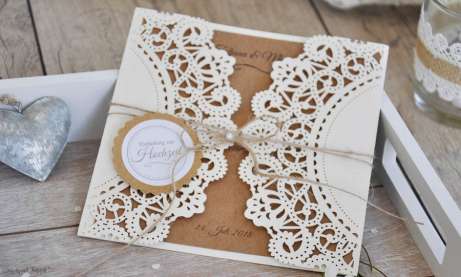Diese besondere Lasercut Hochzeitseinladung wirkt durch ihre schicke Vintage Spitze, in dieIhre Einladungskarte im rustikalen Kraftpapier eingesteckt und mit einem braunen Kordel verziert wird. Die zweiseitige Karte wird mit Ihrem persönlichen Einladungstext von uns gestaltet und bedruckt.