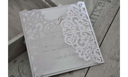 "Ein Traum in ROSA", so haben wir diese wundervolle Lasercut Einladung zur Hochzeit genannt. Die Hochzeitseinladung hat ein schickes rosa Laserschnitt Pocket, in das Ihre Einladungskarte eingelegt wird. Die Lasercut Spitze ist natürlich nicht nur in Rosa erhältlich, sondern gerne auch in blau oder ivory. Der Lasercut schimmert mit einem ganz dezenten und edlen Perleffekt.