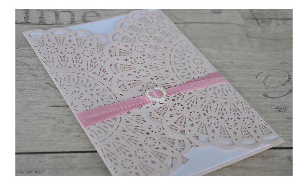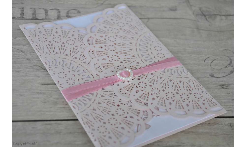 Für alle die rosa lieben, habenwir hier eine ganz elegante Hochzeitseinladung für eine Märchenhochzeit in rosa. Der elegante glitzernde Hochzeitskarten-Einband hat eine edle Spitzenverzierung, die mit Laser ausgeschnitten wurde. Verziert wird die Hochzeitseinladung mit einem passenden rosa Satinband und einem umschlungenen Herz aus kleinen Perlen. Die Einladungskarte mit Ihrem persönlichen Einladungstext zur Ihrer Hochzeit kann praktisch von oben in die verzierte Karte eingeschoben werden.