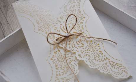 Laden Sie Ihre Gäste mit einer ganz besonderen Lasercut Hochzeitseinladung ein und steigern somit bereits bei Eintreffen der Einladungskarten deren Vorfreude auf das bevorstehende Vintage Hochzeitsfest in 2020. Die edle Lasercut-Spitze gepaart mit dem rustikalen Kraftpapier sind der ideale Mix für den Hochzeitstrend 2020.