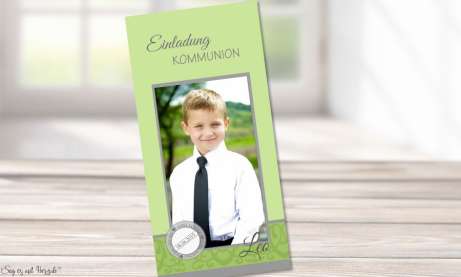 Diese Einladungskarte in frischem grün strahlt Klasse und Eleganz aus, die dem besonderen Fest der Kommunion gleich kommt. Sie ist in modernen Grün Grautönen und einem trendigen Stempel mit der Aufschrift "Einladung" gestaltet. Das schönste Foto Ihres Kommunionkindes macht die Einladungskarte unvergleichgar individuell und unverwechselbar.