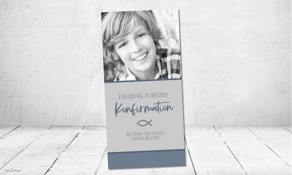Unsere einzigartige Einladungskarte zur Konfirmation ist in den modernen Farben Blau und Grau gestaltet und ist ein wahrhaft schöner Anblick.