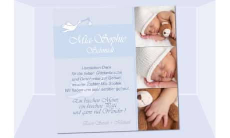 Gerne gestalten wir Ihnen diese Danksagung mit zwei verschiedenen Textvarianten. Somit können Sie eine allgemeine Danksagung an Ihre Freunde und Verwandte versenden und einen speziellen Dank mit extra Text bei Ihrer Hebamme, Frauenarzt, Geburtsklinik abgeben. Bitte teilen Sie uns dazu einfach die gewünschten Einzelmengen sowie die zwei Textvarianten mit.