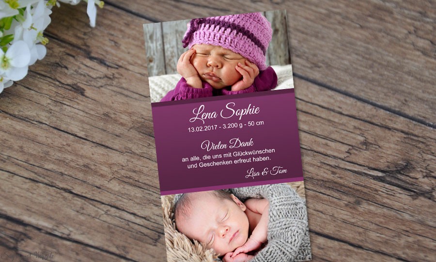 Gerne gestalten wir Ihnen diese Danksagung mit zwei verschiedenen Textvarianten. Somit können Sie eine allgemeine Danksagung an Ihre Freunde und Verwandte versenden und einen speziellen Dank mit extra Text bei Ihrer Hebamme, Frauenarzt, Geburtsklinik abgeben. Bitte teilen Sie uns dazu einfach die gewünschten Einzelmengen sowie die zwei Textvarianten mit.