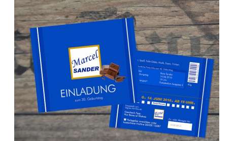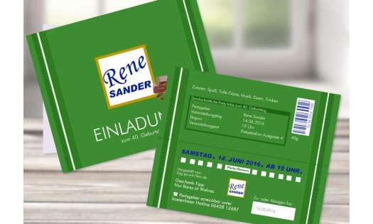 Hier haben wir eine etwas andere Einladungskarte zum 40. Geburtstag kreiert. Passend für alle, die Schokolade lieben und eine witzige und spaßige Einladungskarte zum Geburtstag suchen. Die Karte ist natürlich in Ihrer Lieblingssorte (Farbe) erhältlich. Zum Anbeißen...