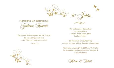 Eine besonders schicke Einladung die dem Fest der Goldhochzeit die entsprechende Wertigkeit wiederspiegelt und Ihre Gäste auf besondere Art einlädt.