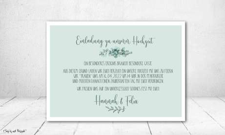 Für jetzt und für immer. Wunderschöne Hochzeitseinladung im Boho Greenery Stile für Ihren schönsten Tag im Leben. Wundervoll platzierter Eukalyptus kombiniert mit modernen Schriften in grün, machen Ihre Einladungskarte zu einem wahren Hingucker. Ein Hochzeitsmotto, z.B. "Für jetzt und für immer" sowie Ihre Namen werden mit einem wundervollen Eukalyptus Rahmen liebevoll hervorgehoben. Die Hauptfarbe Ihrer Einladungskarte ist ein helles edles grün, welches durch grau-grüne Schriften ergänzt wird.