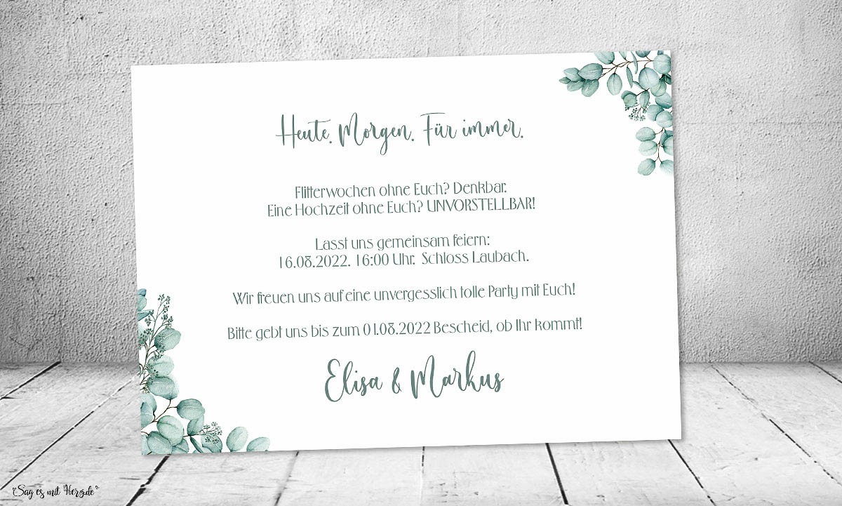 Heute. Morgen. Für immer. Laden Sie mit diesen wundervollen Worten und Ihrem schönsten Foto Ihre Gäste zu Ihrer Greenery Hochzeit ein. Die Einladungskarte ist mit liebevollen Eukalyptus Blättern in modernem grün verziert. Unser portofreundliches Postkartenformat DIN A6 wirkt modern und lässig. Auf der Vorderseite Ihrer Einladungskarte platzieren wir für Sie Ihr schönstes Foto. Die Einladungskarte ist aus edlem Leinenstrukturpapier, wodurch Sie eine ganz besondere Haptik Ihrer persönlichen Boho Einladungskarte erhalten.
