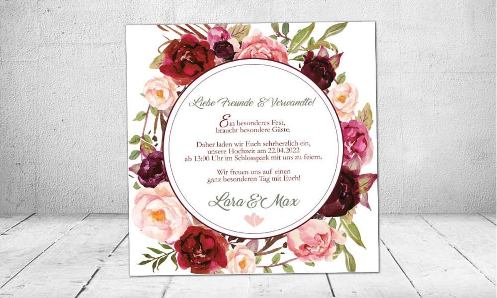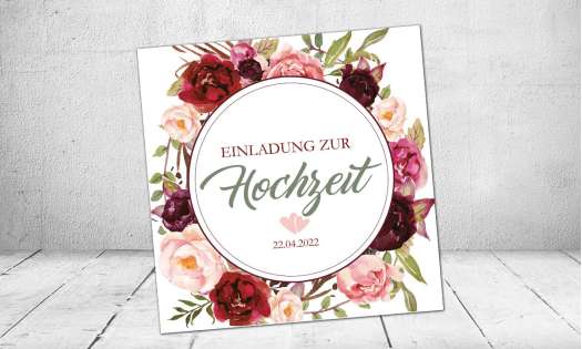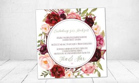 Diese zauberhafte Hochzeitseinladung wird Ihre Gäste begeistern. Die Einladungskarte ist im modernen quadratischen Format gestaltet und besticht durch ihre trendbewusste Form sowie Farbtönen in Rot, Kupfer und Grün. Das florale Design im verspielten Boho Look ist ein wahrer Blickfang. Die Einladungskarte wird auf edlem Leinenstrukturpapier gedruckt, wodurch sich die tolle Farbgebung des floralen roten Designs der Einladungskarte besonders hervorhebt.