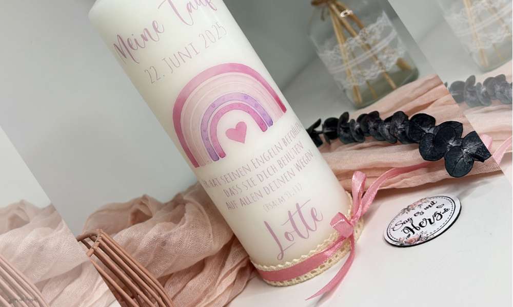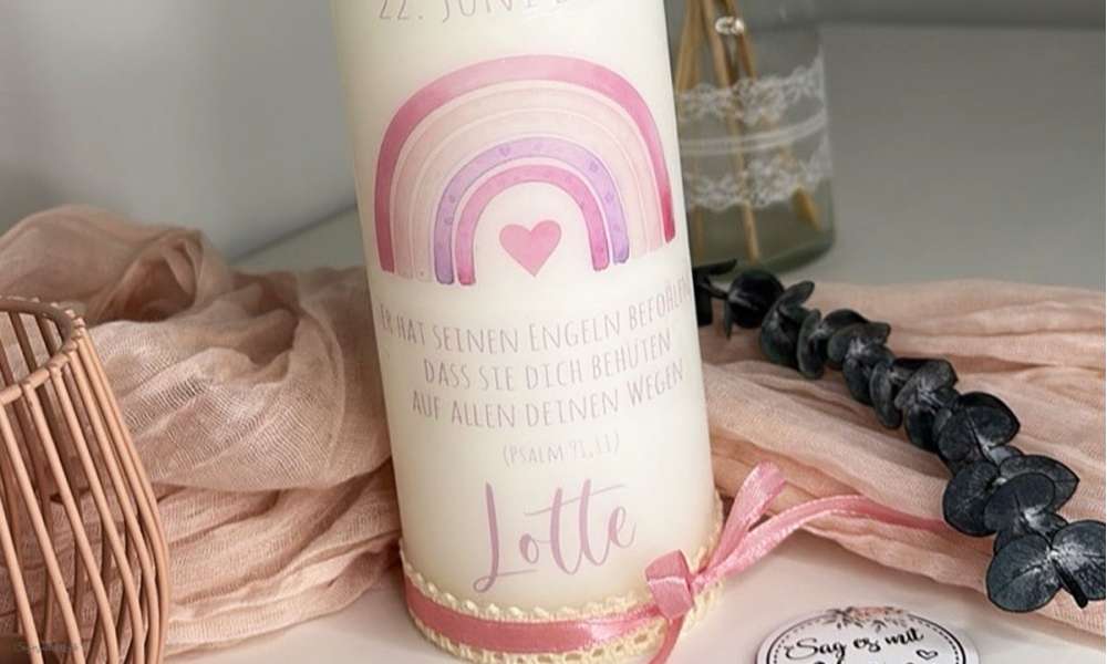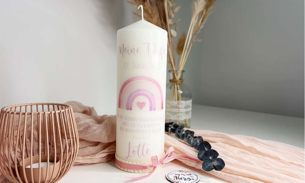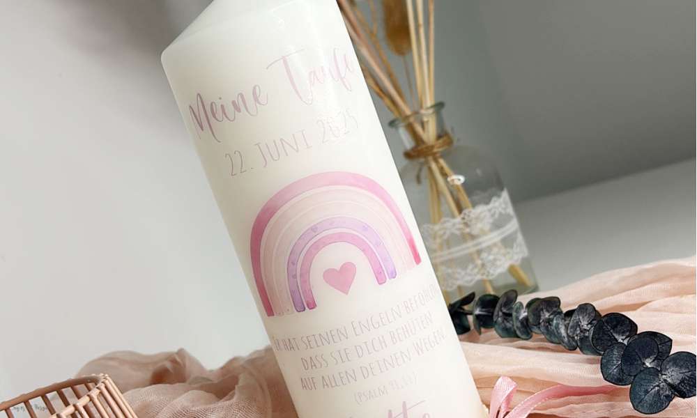 Kerze Kommunion Regenbogen - moderne liebevolle Gestaltung mit Name, Datum, Spruch und Regenbogen in rosa