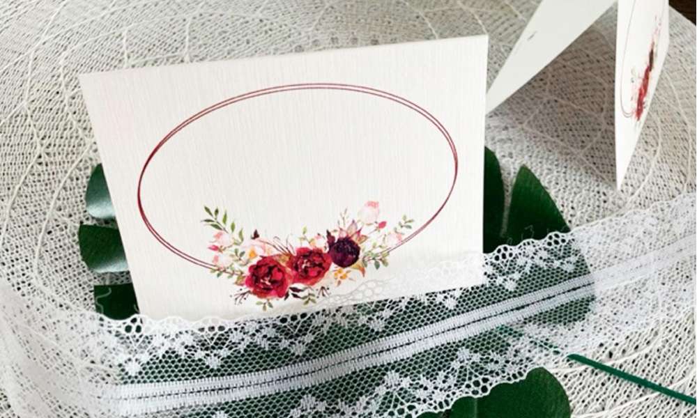 Die Platzkarte ist mit einem roten Blumenkranz designt und läd Ihren Lieblingsgast zu einem wunderschönen Fest ein. In den roten Kreis können Sie den Namen Ihres Gastes per Hand reinschreiben oder mit Ihrem Drucker zu Hause als DIN A6 Karte auch bedrucken.