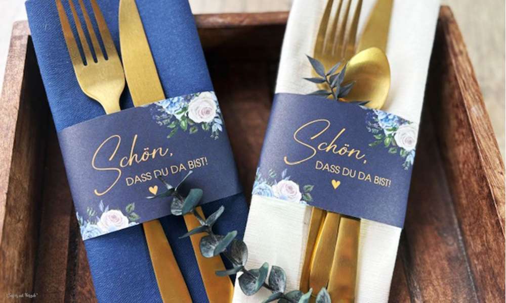 Ob zur Hochzeit, Taufe, Konfirmation, Kommunion oder einem festlichen Dinner: Diese Serviettenbanderole ist eine stilvolle Möglichkeit, Besteck zu präsentieren – besonders harmonisch in Kombination mit goldenem Besteck!