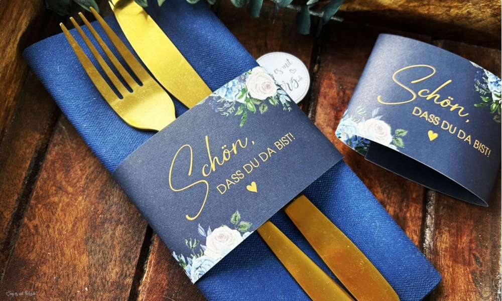 Serviettenbanderole Bestecktasche Schön, dass du da bistServiettenbanderole Bestecktasche Schön, dass du da bistServiettenbanderole Bestecktasche in Dunkelblau mit Gold – Schön, dass Du da bist ♥