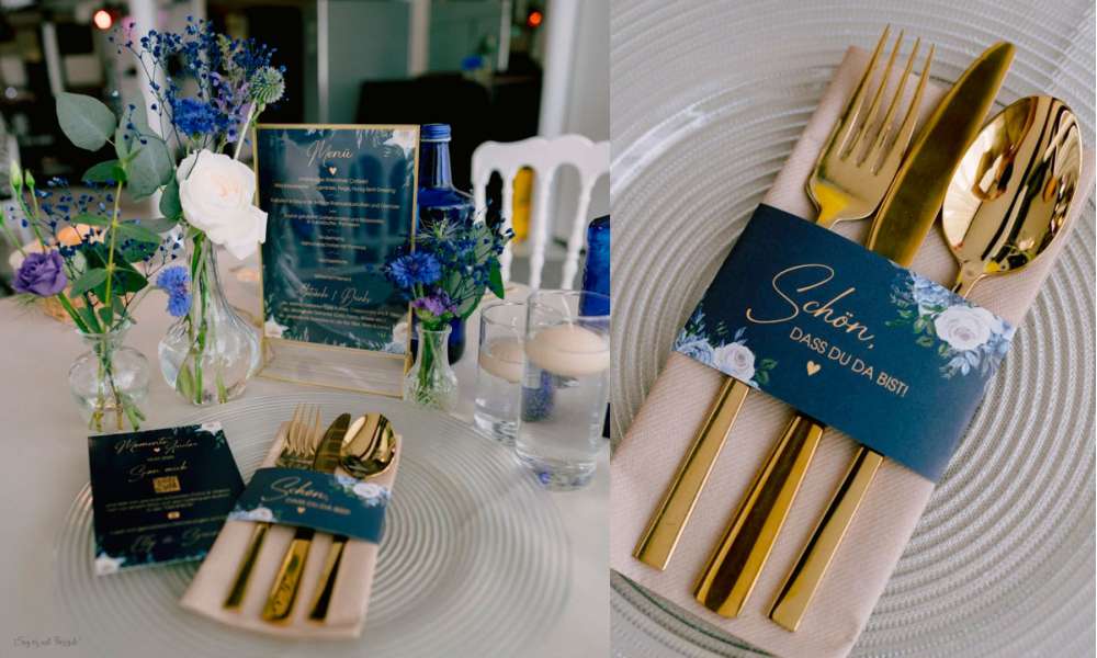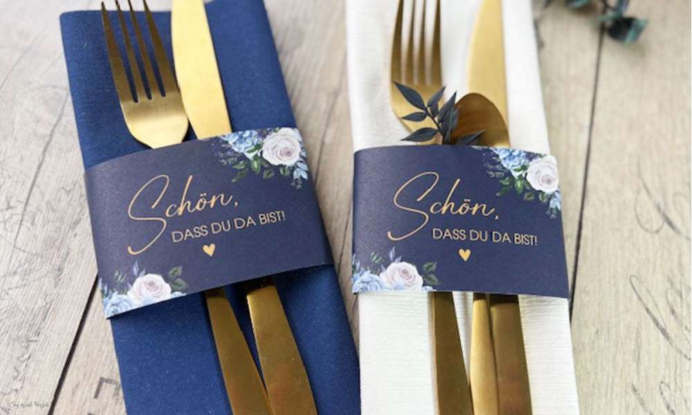 Die Serviettenbanderole lässt sich mühelos um eine edle Stoff- oder Papierserviette legen – besonders schön in Dunkelblau, Weiß oder Gold. Dank ihrer sanften Farben und der hochwertigen Gestaltung passt sie perfekt in elegante Tischdekos und sorgt für ein stimmiges Gesamtbild auf jedem Sitzplatz.