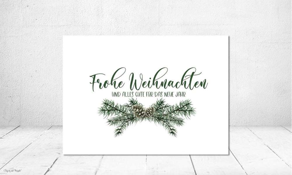 Die elegante Firmen Weihnachtskarte ist aus weißem edlem Leinenstrukturpapier angefertigt. Sie schaut modern und sehr edel aus. Ein Hauch von Vintage Flair vermitteln die dunkelgrünen Schriftzüge mit dem Aquarell gezeichneten Tannenzweig.